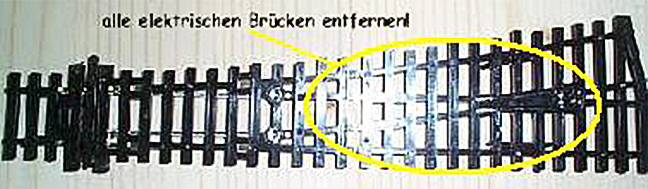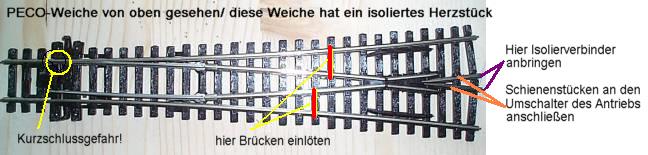 Hier ist eine Weiche mit isoliertem Herzstück abgebildet. Wenn man einen Weiche mit elektrisch leitendem Herzstück entsprechend umarbeitet funktioniert das bei dieser auch und es entstehen keine Kurzschlüsse. Als Beispiel dient eine Weiche von PECO. Andere Fabrikate sind ähnlich aufgebaut und können sicher auch umgebaut werden.